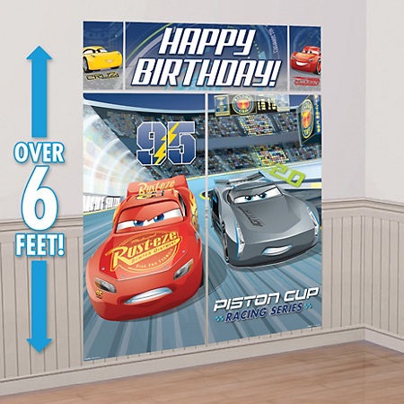 This plastic Cars 3 Scene Setter Kit includes two large posters featuring Lightning McQueen and Jackson Storm racing against each other. The two smaller posters also feature Lightning McQueen and Cruz Ramirez and the long banner features a “Happy Birthday!” headline. Combine all the posters to use it as a wall decoration or as an awesome photo backdrop for your Disney Cars 3 party! Measures 65in x 75in when assembled.