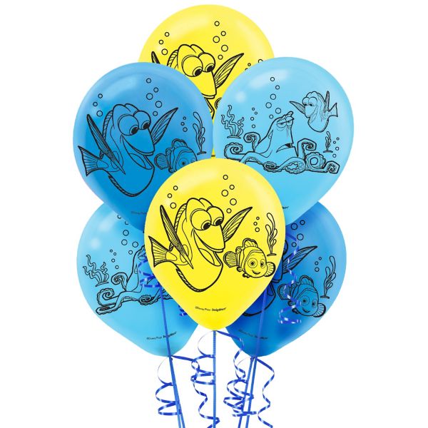 Finding Dory Balloons product details: •6 per package •2 each of 3 colors: blue, light blue, and yellow •12in tall when fully inflated •Latex