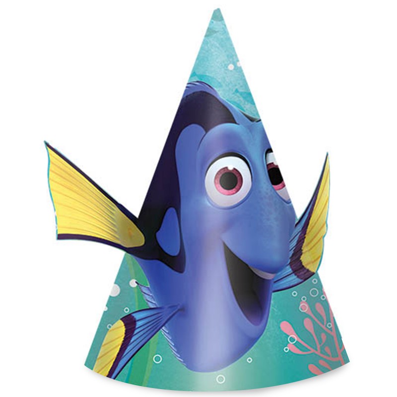 Finding Dory Party Hats product details: •8 per package •4 1/2in diameter at base x 6 1/4in tall •Cardstock •Attached elastic •One size fits most