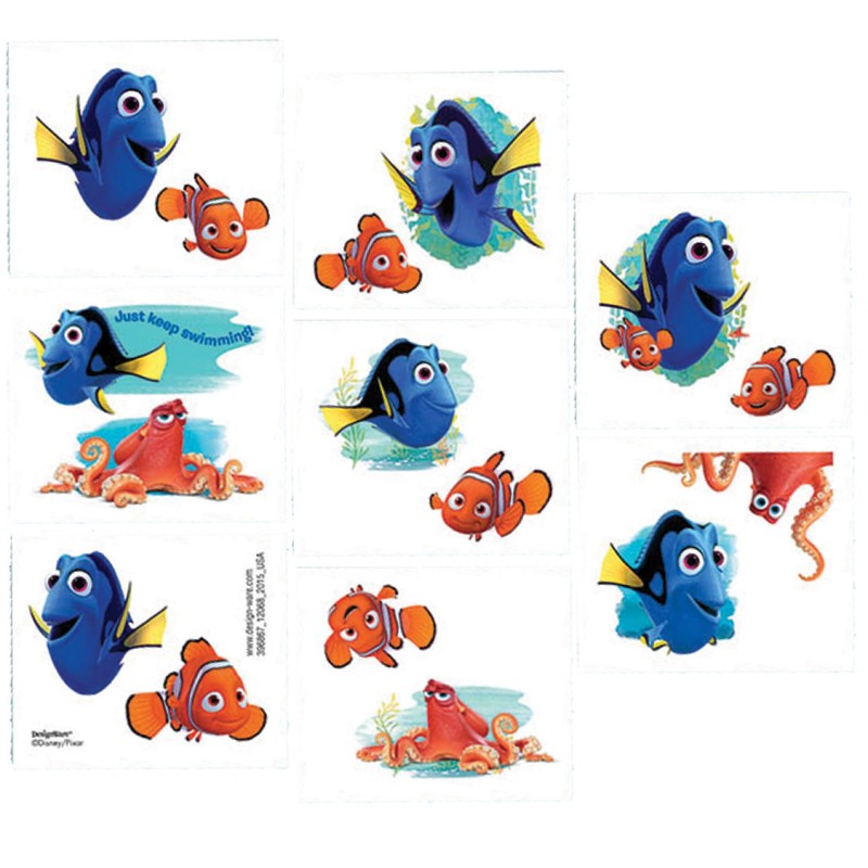 Finding Dory Tattoos product details: •16 tattoos •8 perforated squares, 2in wide x 1 3/4in tall •Sheet, 4in wide x 7in tall •Easily applied with a damp cloth •Easily removed with baby oil