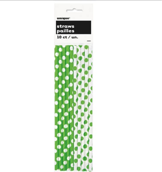 Each paper straw features a pretty red and white design. One package includes 10 paper straws that measure 8.25”. •Includes: ◦20 Green Polka Dot Paper Straws