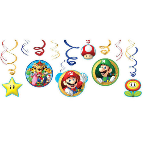 Super Mario Swirl Decorations include: •6 swirl decorations •3 swirl decorations with 7in cutouts •3 swirl decorations with 5in cutouts •Attached hooks