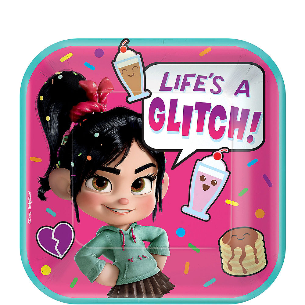 These Wreck-It Ralph Dessert Plates feature a “Life’s A Glitch!” headline against a bright pink background. Prints of targets sprinkles and tasty food are also featured on the square plates. Serve up slices of cake or other sweet treats at your child’s Wreck-It Ralph theme birthday party on these small paper plates.