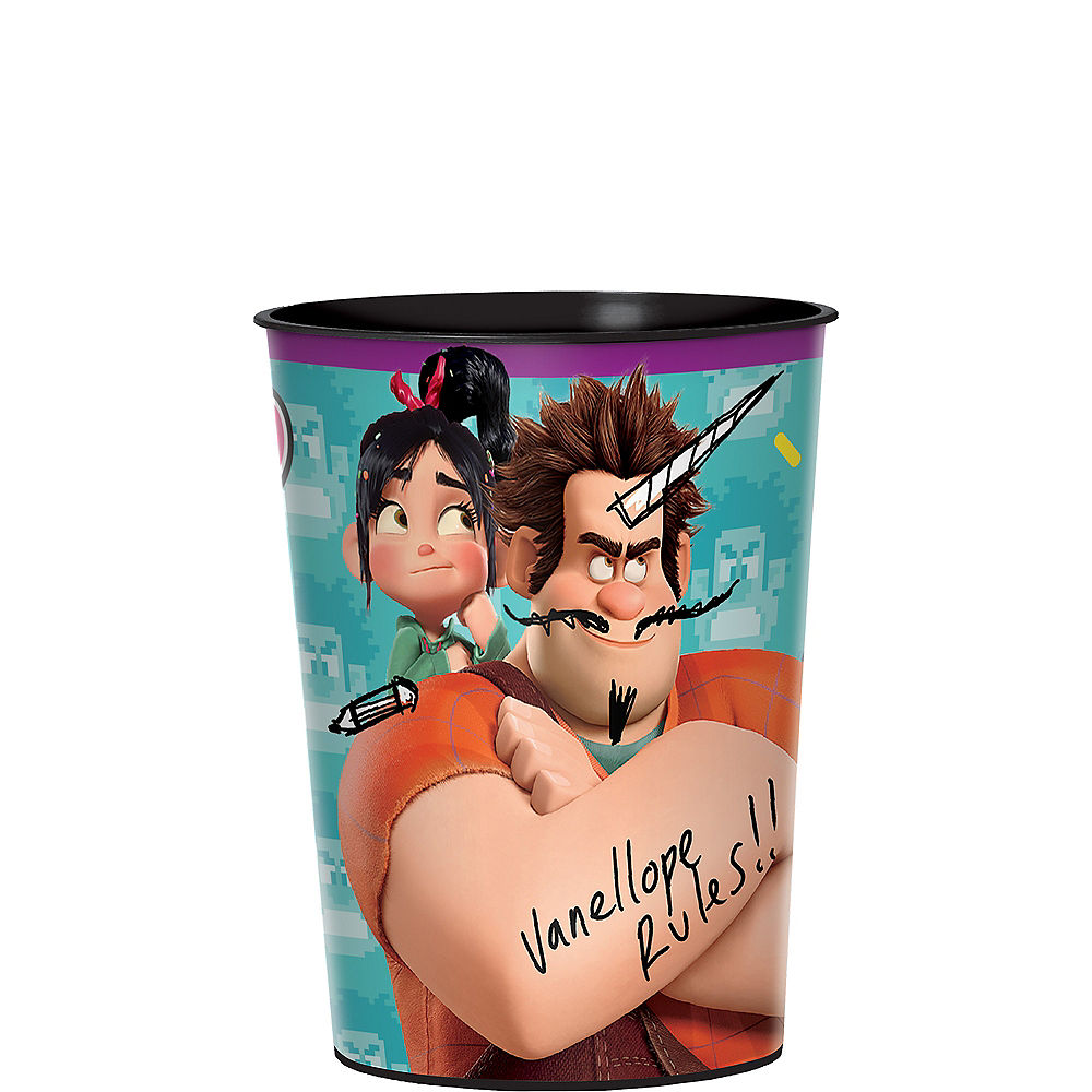 Add even more fun to the party with a Wreck-It Ralph Favor Cup filled with treats and toys (not included)! This black plastic cup features a print of Vanellope and Ralph against a pixelated blue background. A funny mustache and unicorn horn are drawn onto Ralphs face! Fill this reusable cup with candy, party favors, or cool beverages at your child’s Wreck-It Ralph birthday party.